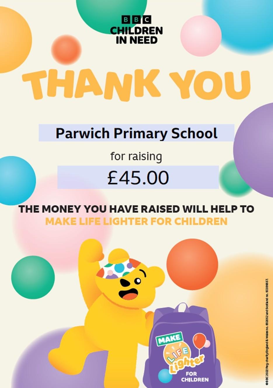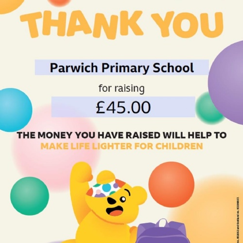 With the support of School Council, the Chair created an innovative way of raising funds to help children less fortunate. They came up with the idea of choosing Pudsey Bear's middle name and held a Non-Uniform Day. At £1 an entry, Parwich Primary children raised a super £82.40. The winning name was Evan. Pudsey Evan Bear is enjoying his time at his new home. Thank you to all who entered.